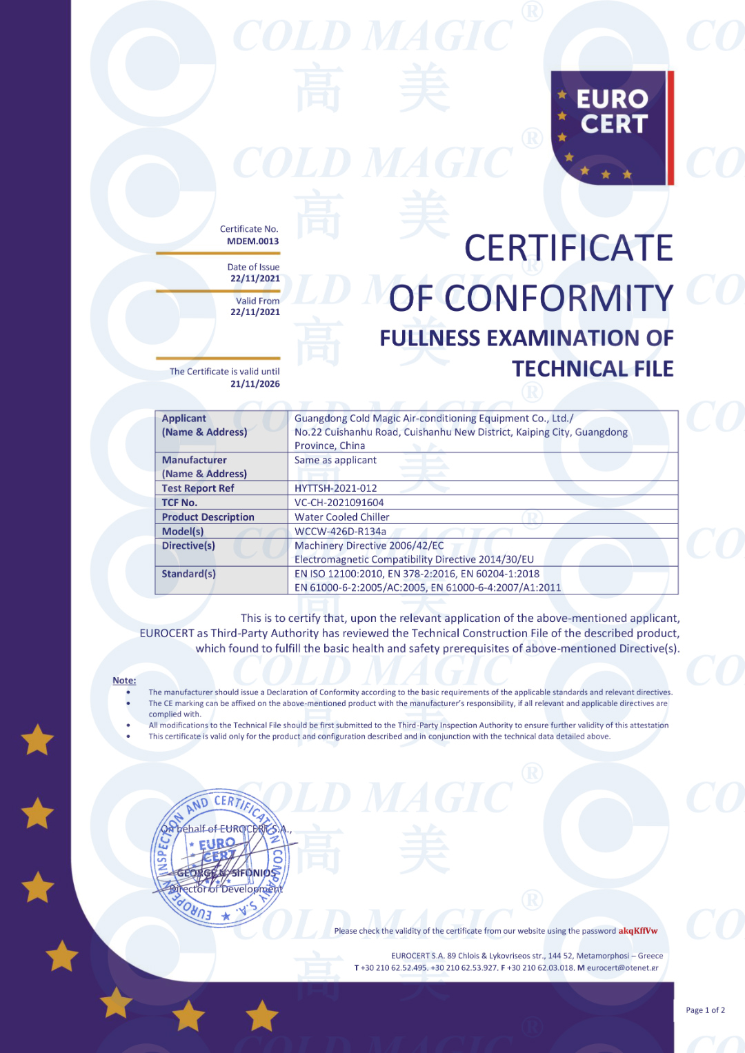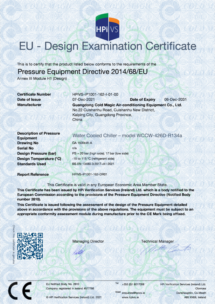 货柜式水冷冷水机组取得CE & PED认证证书
